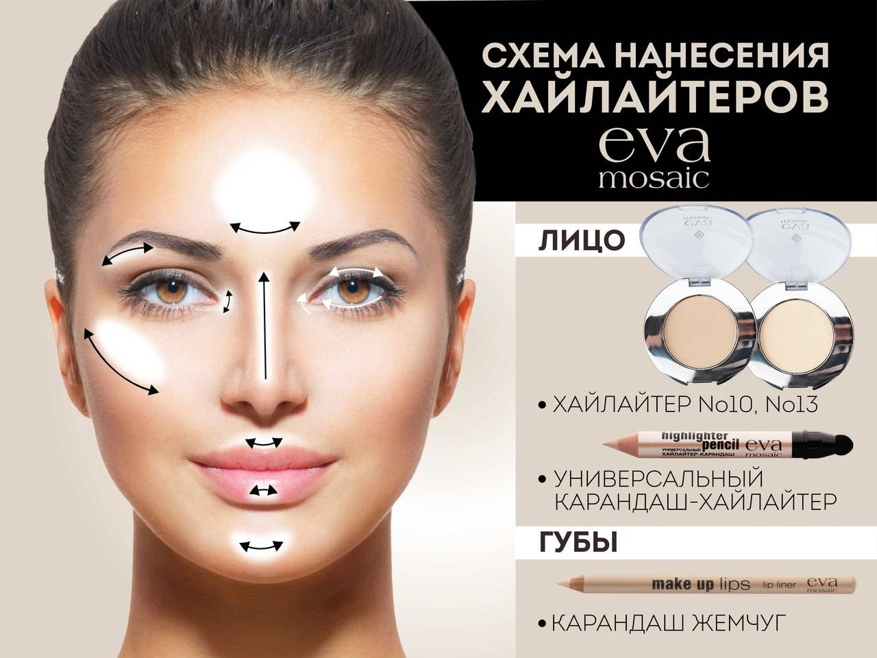 Эта универсальная схема подходит для большинства девушек. При некоторых особенностях (крупная челюсть, широкие скулы, высокий лоб) она меняется. Использование консилеров для изменения черт лица называется кремовой коррекцией.