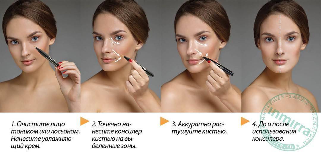 Схемы нанесения декоративной косметики, в том числе и консилера, могут быть разными в зависимости от формы и особенностей лица. Но все же есть общее пошаговое руководство, как пользоваться консилером для лица: