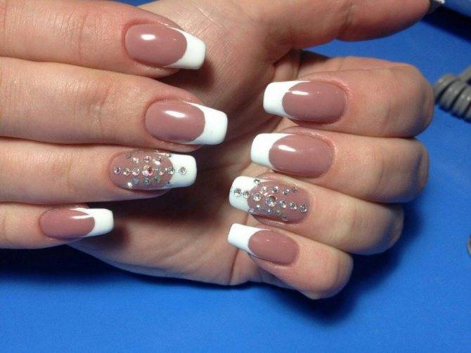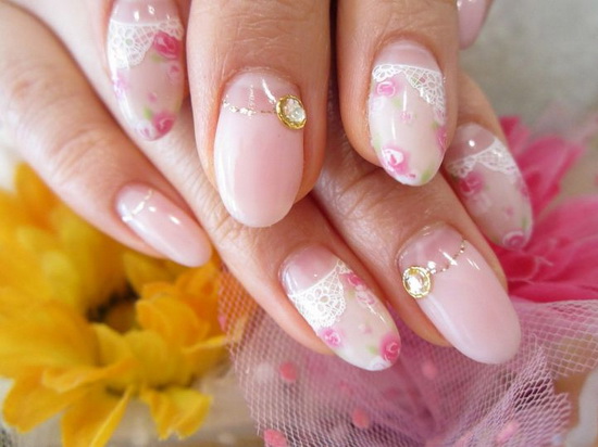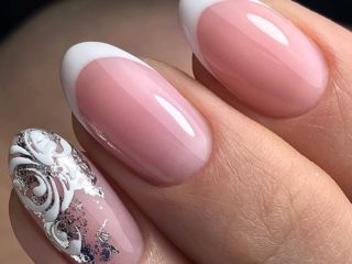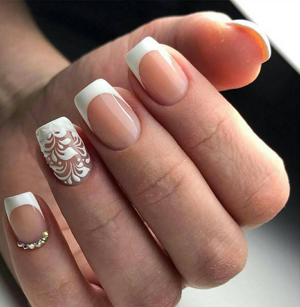 Обычно он дополняется кружевными узорами, флористическими мотивами, художественной росписью, стразами. Такой вариант всегда популярен, так как отличается скромностью и изяществом. Такой маникюр идеально подходит для длинных и средних ногтей. Классические оттенки – полупрозрачный розовый, бежевый, молочный, нюдовый.