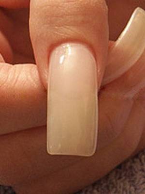 Нанести розовый лак ровным слоем на всю поверхность ногтя под линией. После высыхания лака нанести второй слой. На искусственных ногтях необходимо следить, чтобы край ногтя также был закрашен. Не дожидаясь высыхания лака, перейти к следующему этапу.