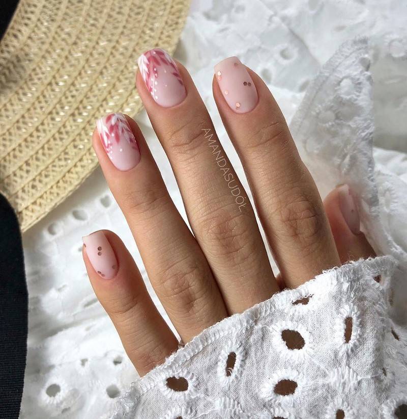 Очень красиво будет смотреться подобный дизайн в матовых оттенках, делая розовый маникюр 2020-2021 эффектным и спокойным. Для рисунков и украшений для розовых ногтей характерен минимализм. Поэтому самыми актуальными рисунками для такого маникюра с розовым лаком станут мелкие цветочки, веточки, полоски и точки.