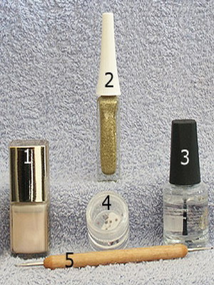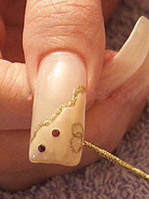 Используя золотой косметический карандаш, провести прямую линию по границе розового лака.