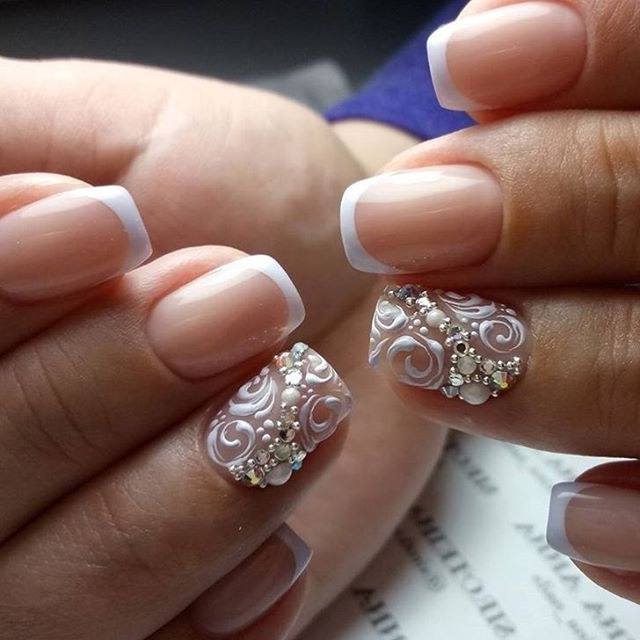 Существуют различные вариации французского маникюра для невесты. Например, один ноготок можно украсить стразами или красивым рисунком. Это привнесёт в образ невесты особую изюминку.
