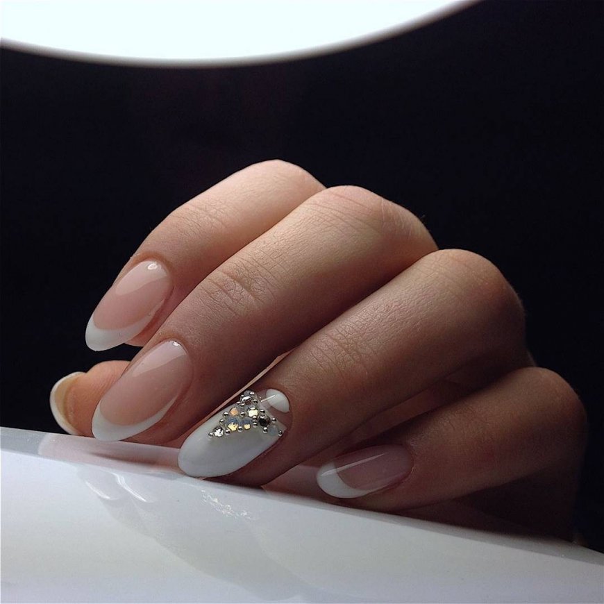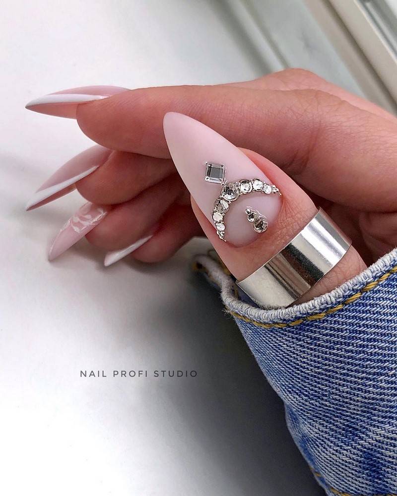 В маникюре невесты в 2022 году приветствуется лунный дизайн во всем своем великолепии, многообразии и лаконичности. Для такого торжественного события как свадьба отлично подойдет маникюр с использованием декора стразами: крупными и мелкими, разной формы и цвета.