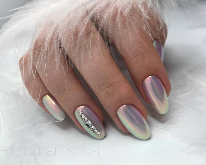 Дизайн ногтей с втиркой за счет преломления света образует великолепные переливы.