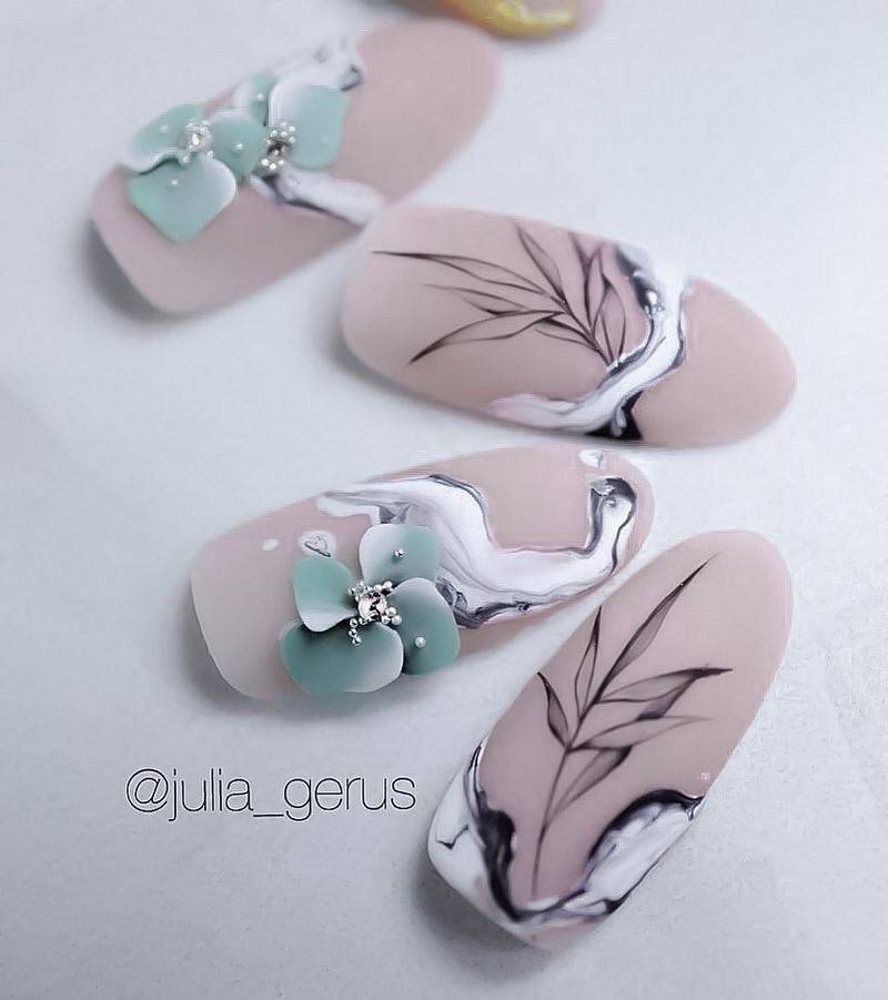Тонкой кисточкой можно нарисовать большой красивый цветок на нейтральном фоне, как на фото. Сочетание лишь двух оттенков и замысловатое переплетение линий, как при выполнении розы, позволяет добиться элегантного и женственного маникюра. Укрась безымянный палец маленькой жемчужиной под цвет рисунка, чтобы подчеркнуть роспись, цвет фона, и сделать дизайн нарядным.