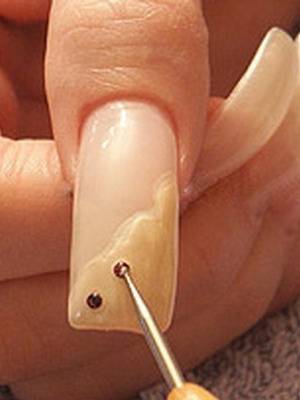 При помощи увлажненного кончика иголки подцепить страз и установить его в нижнем углу прокрашенной поверхности ногтя. Второй страз установить немного выше первого. Стразы должны идти параллельно границе лака. Прижать их пинцетом к ногтю, чтобы стразы лучше закрепились.