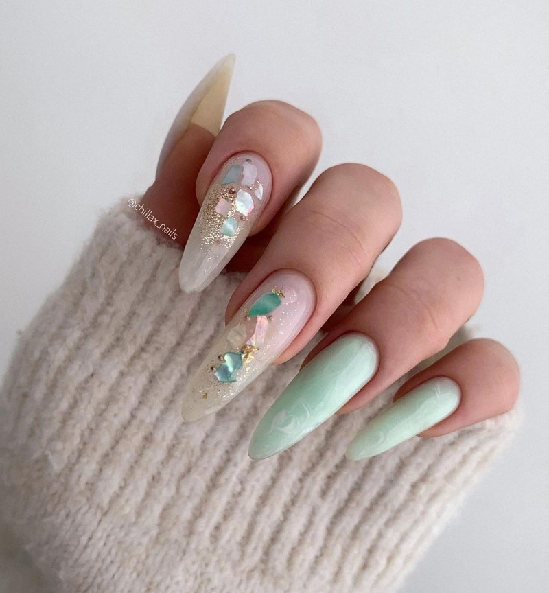 Техника опалового маникюра создаст неповторимое мерцание и блеск на ногтях, покрытых сочетанием лаков изысканных пастельных оттенков и блестящими элементами: пайетками, глиттером, камифубуками, фольгой.