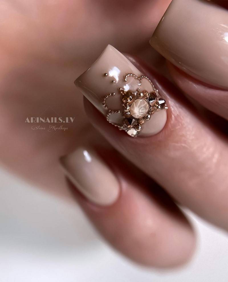 Цвет лака для ногтей можно подобрать в соответствии с цветом платья. Если платье выбрано в бежевом цвете, маникюр должен быть также в бежевых оттенках.