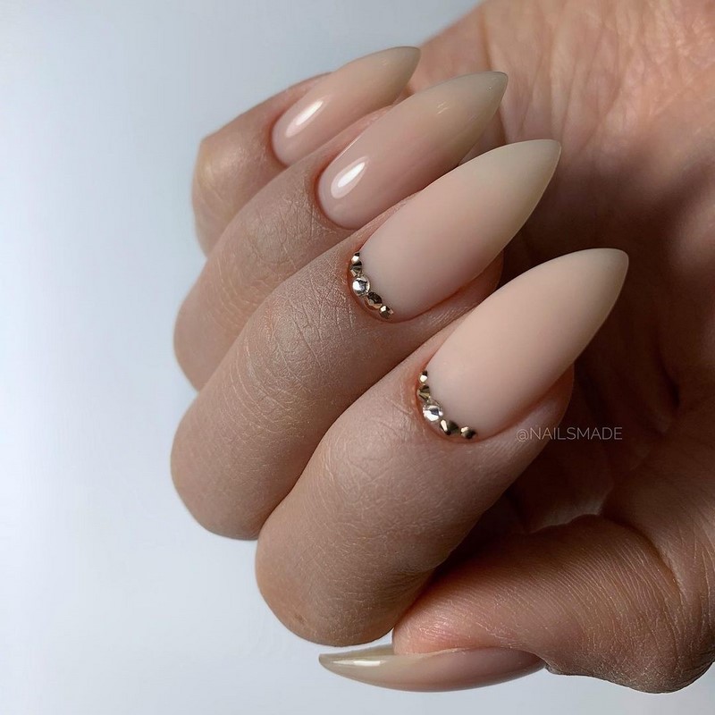 Маникюр с естественным цветом покрытия прочно закрепился как самый популярный среди девушек. Он идеально подходит как для повседневного образа, так и торжественного выхода. Нюдовый дизайн имеет множество вариантов и прекрасно сочетается с любой формой и длиной ногтей. Декором для трендового маникюра могут служить стразы, фольга, пайетки и блёстки.