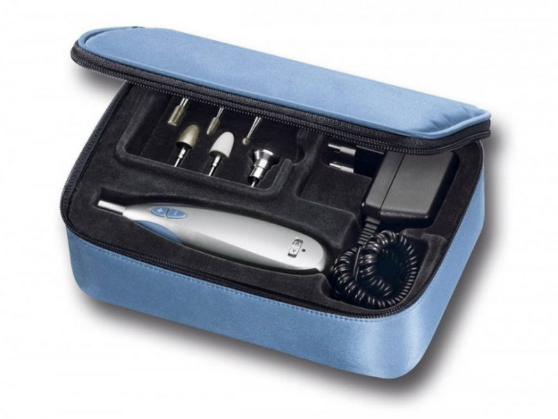 Аппарат для маникюра и педикюра состоит из блока управления и рабочей рукояти. Оснащен регулировкой оборотов фрезы, поддерживает реверсный режим. Есть система защиты от перегрузок — при излишнем нагреве маникюрный прибор просто отключается. Мощность устройства составляет 64 Вт, прибор поставляется в металлическом корпусе.