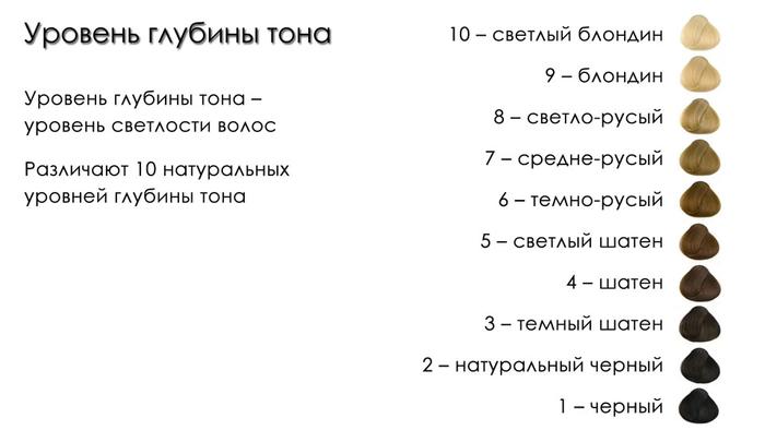 Для удобства и взаимопонимания мастера колористики определили 10 уровней глубины тона и обозначили их цифрами от 1 до 10. Это базовые тона, по цифровому номеру можно судить о его светлости: 1 — самый темный, 10 — самый светлый.