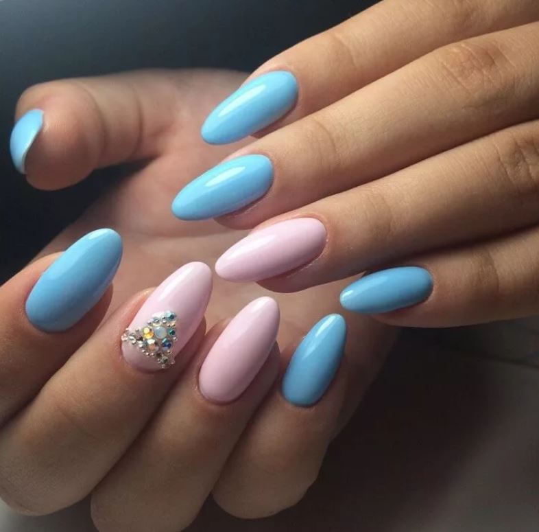 Светло-голубые ногти придают образу нежность, яркость, свежесть. В 2019 году модно смешивать голубой и розовый колоры.