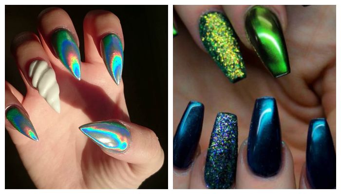 Голографическая втирка делает маникюр оригинальным: он переливается разными оттенками и потрясающе блестит на солнце.