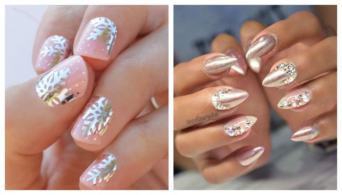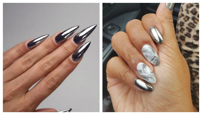«Классикой» можно считать зеркальный маникюр. Его выполняют с помощью серебристой пудры. Покрытые белым гель-лаком ногти с втиркой серебристого цвета – универсальный вариант, который сочетается с повседневным гардеробом и может легко дополнить праздничный образ. Пудру можно нанести на 1 – 2 пальца, чтобы не перегрузить дизайн.