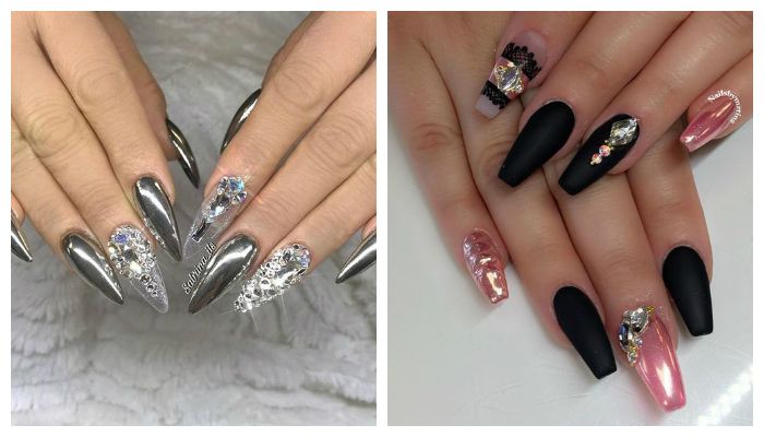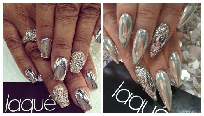 Зеркальный лак может как использоваться сам по себе, так и служить эффектной основой для дальнейшего декорирования. Не рекомендуется использовать сочетание такого лака с блестками, так как это удешевляет внешний вид, но зато можно сочетать несколько вариантов дизайна на разных ногтях.