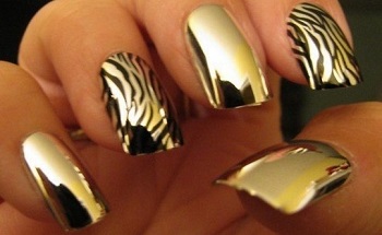 Эффектно выглядит на ногтях чередование зеркальных полосок с полосками лака