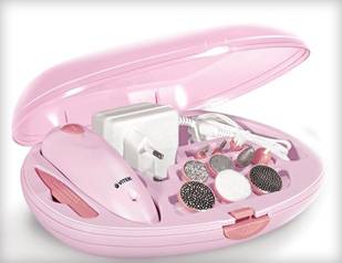 Электрический набор одинаково эффективен для маникюра и педикюра. В нем 8 насадок из разных материалов, выполняющий большой спектр действий: опиливание кожи, ногтей, удаление огрубевших частиц, мозолей, снятие эпидермиса в труднодоступных местах (уголки возле свободного края). Есть и другие функции, заслужившие похвалы от пользователей: