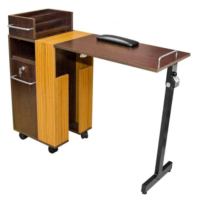 Если маникюрный стол уже оборудован тумбой, все же лучше докупить еще тумбочку, желательно, чтобы она имела колесики. Так мастер ногтевого сервиса может брать некоторые инструменты оттуда сидя, не покидая своего места.