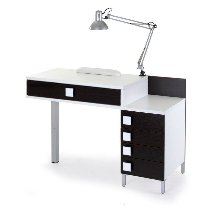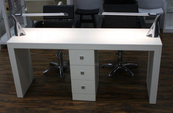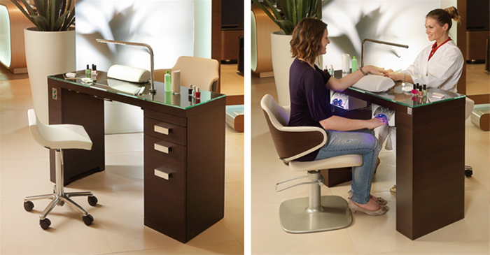 Маникюрный стол может иметь стандартную или необычную форму столешницы, одно или два посадочных места для клиента. Он может быть складным или обычным, с тумбой или без, со встроенным освещением и вытяжкой и так далее.