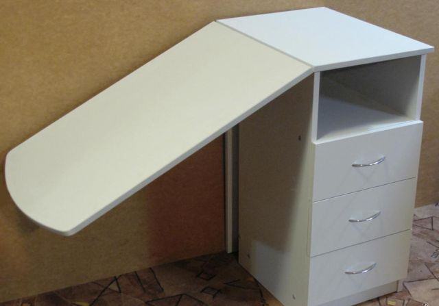 Чаще всего конструкция представляет собой тумбу с раскладывающейся столешницей. Стол крайне полезен для работающих дома. Много места не займет, а выполнить качественную работу позволит.