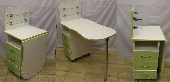 Когда же вы делаете стол своими руками, то ориентируетесь на индивидуальные размеры, можете сделать угловой или складной столик. Стол, изначально задумывающийся как маникюрный, впоследствии способен использоваться и для широкого спектра косметических процедур.