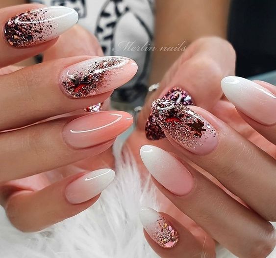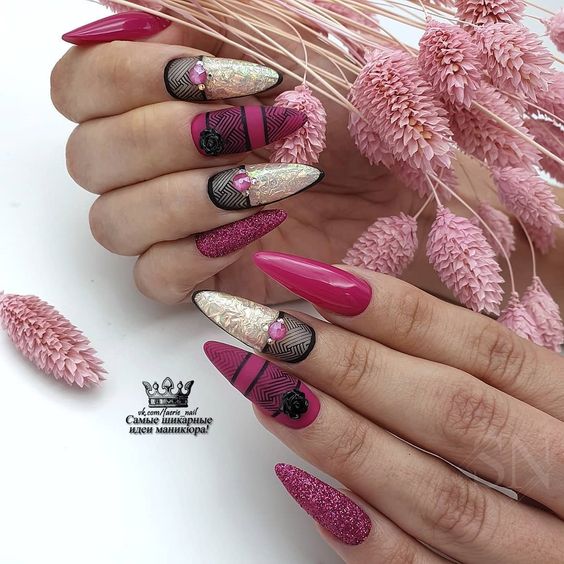 Окрашенные двумя или несколькими цветами ногти также должны быть красиво и аккуратно украшены, стразами, блестками, цветками, кружевами.