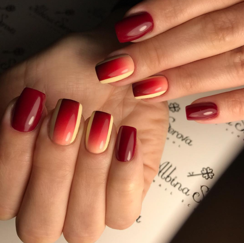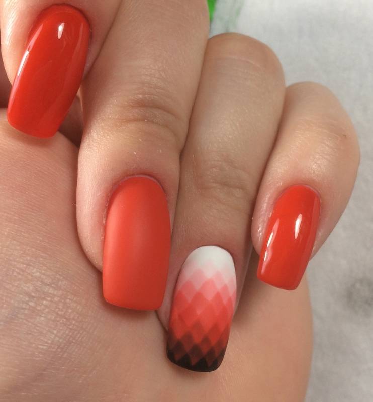 Для соблазнительного нейл-дизайна подойдет такой эффект, как градиент. Плавный переход от темного оттенка к ярко-красному придает ногтям элегантность и стиль. Более легким и свежим будет выглядеть сочетание красного с розовым, оранжевым. В моде градиент с использованием пастельных тонов.