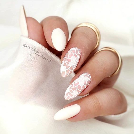Дизайн свадебный маникюр на средние ногти с кружевом и веточками