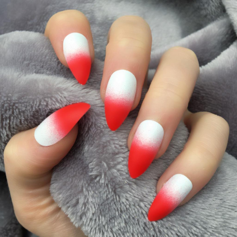 Для создания яркого необычного дизайна алые оттенки можно сочетать с трендовым в следующем году белым цветом. Плавный переход от красного к белому создаст эффект французского маникюра.