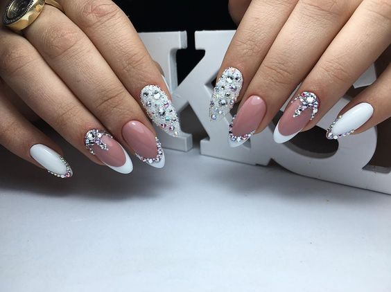 Эти мелкие блестящие камушки очень красиво мерцают на солнце и в искусственном свете, привлекая внимание к рукам невесты. Однако современная мода предполагает размещение таких украшений на отдельных ногтях, ни в коем случае, не на всех, иначе это будет выглядеть не нежно и привлекательно, а вульгарно.