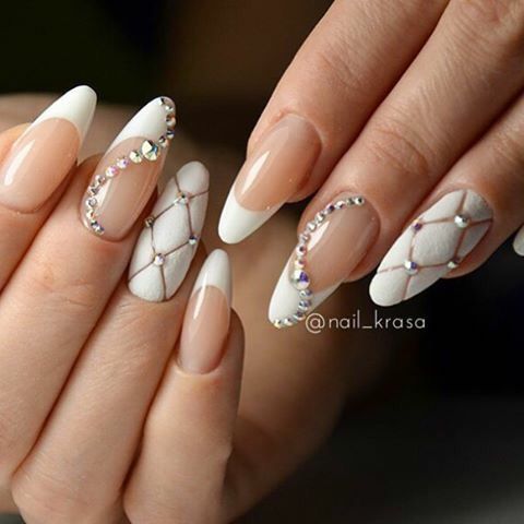 Эти мелкие блестящие камушки очень красиво мерцают на солнце и в искусственном свете, привлекая внимание к рукам невесты. Однако современная мода предполагает размещение таких украшений на отдельных ногтях, ни в коем случае, не на всех, иначе это будет выглядеть не нежно и привлекательно, а вульгарно.