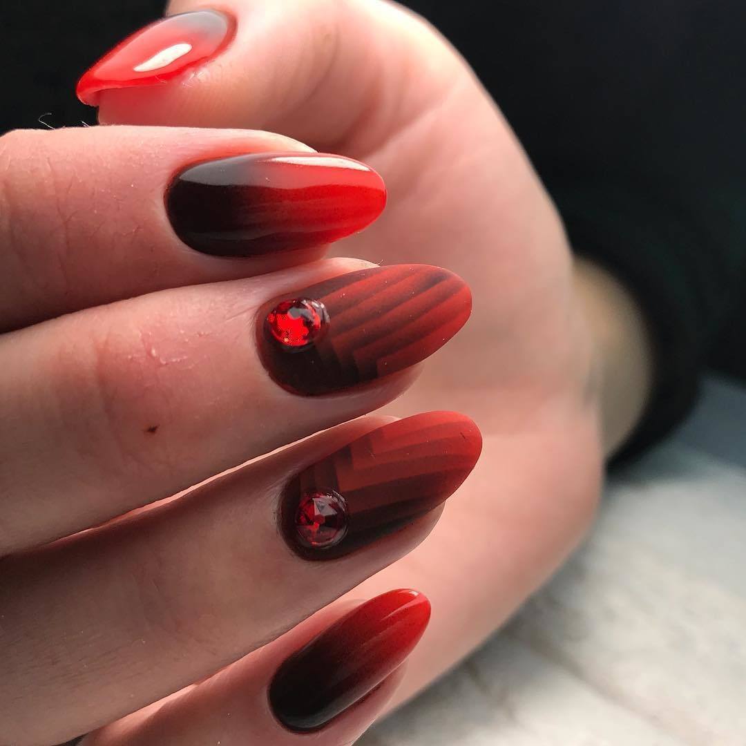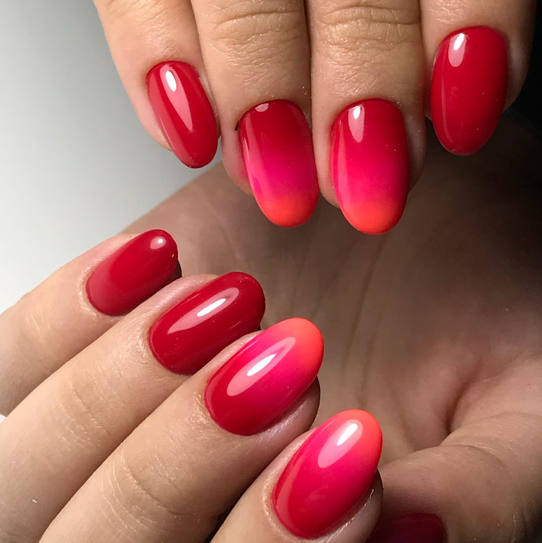 Для соблазнительного нейл-дизайна подойдет такой эффект, как градиент. Плавный переход от темного оттенка к ярко-красному придает ногтям элегантность и стиль. Более легким и свежим будет выглядеть сочетание красного с розовым, оранжевым. В моде градиент с использованием пастельных тонов.
