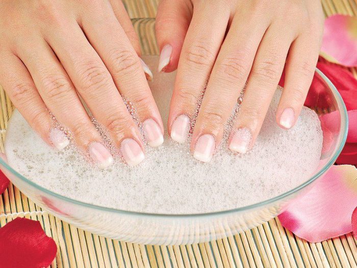 Правильная температура воды – 37-38С, она распарит кожу, но не убьет все полезные вещества в компонентах. Какие рекомендуются ванночки для ногтей: