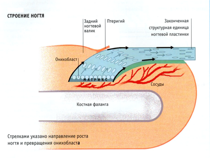 - Слои ороговевших клеток пластины расположены близко друг к другу. Ноготь растет выше ложе, постепенно выходя за его края, где нет кровеносных сосудов и нервов. Розовый оттенок пластине дает наличие кровеносных сосудов, которые проходят под ней.