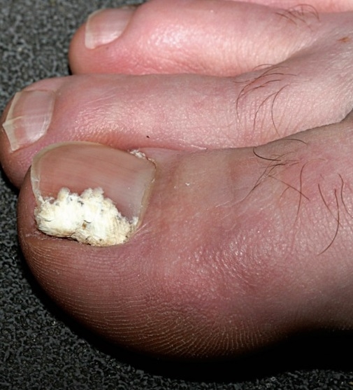В крайней стадии развития микоза после отхождения рогового слоя виден обнаженный участок эпидермиса под ногтем, покрытый чешуйкообразными наслоениями. Больной испытывает болезненные ощущения при контакте пальцев с обувью. Ногти, пораженные грибком, выглядят отталкивающе.