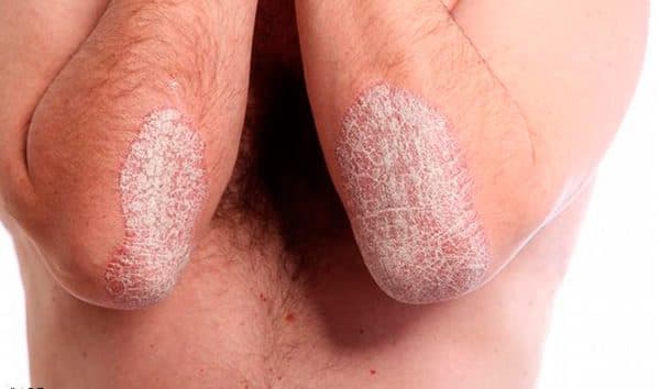 Псориаз, экзема — кожа на локтях и коленях становится белее, обрастает белыми чешуйками в окружении красной сыпи.