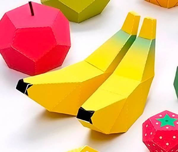 Низкополигональная модель банана из бумаги, собранная в технике паперкрафт.