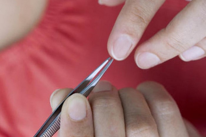 - Если занозу видно, край инородного тела торчит, подцепите его пинцетом и потяните под тем же углом,