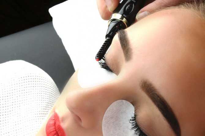 Если с помощью термощипцов завивать нужно чистые ресницы, то плойкой разрешается пользоваться на окрашенных волосках. В данном случае закручивание происходит за счет поступательных движений щеточкой, нагретой до определенной температуры.