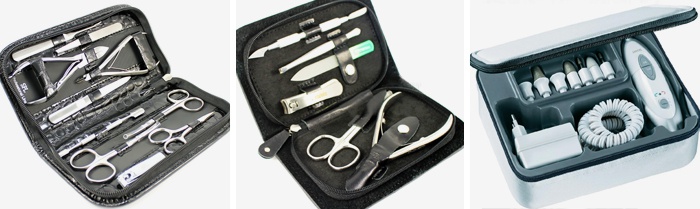Такие наборы содержат пилки, которые имеют различную степень шероховатости и отличаются разными размерами. Кроме того, в их состав входят ножницы и лопатки для кутикулы. В некоторых случаях подобные наборы содержат косметические средства, предназначенные для ухода за ногтями. Это могут быть масла, укрепляющие лаки, кремы или молочко.