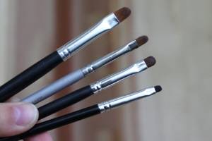 Равномерное нанесение теней невозможно без использования плоской кисти. Она выпускается в двух размерах: маленькая и большая. Кроме нанесения и растушевки теней подходит для прорисовки внешнего уголка глаза. Линия ресниц прорисовывается маленькими кисточками, которые внешне напоминают карандаш. Ими удобно растушевывать линию карандаша и наносить тени на нижнее веко.