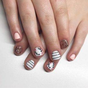 Нестареющая классика базы под нейл-арт, а так же самостоятельный цвет для покрытия. На сегодняшний день популярная концепция – чёрный с белым. Также стоит выделить розово-белый и красно-белый, сочетание для торжеств и будней. Молочный как незаменимое приложение к любому образу, создаёт ощущение воздушности.