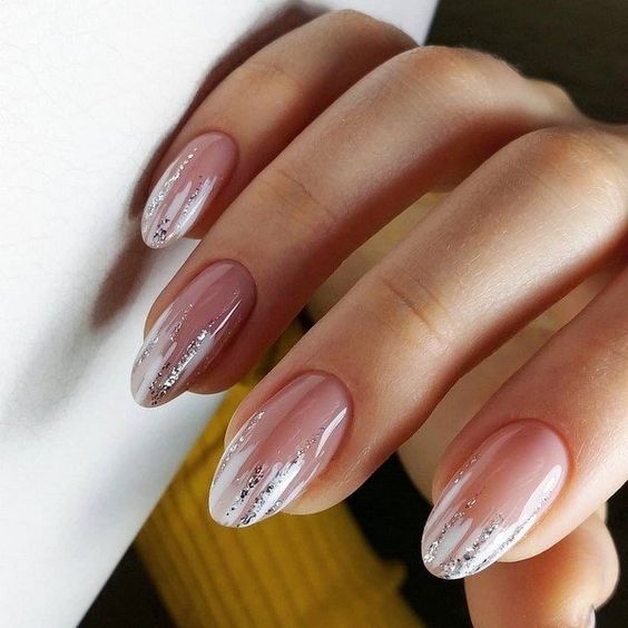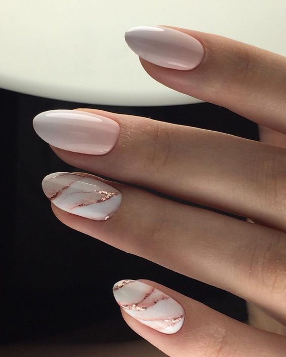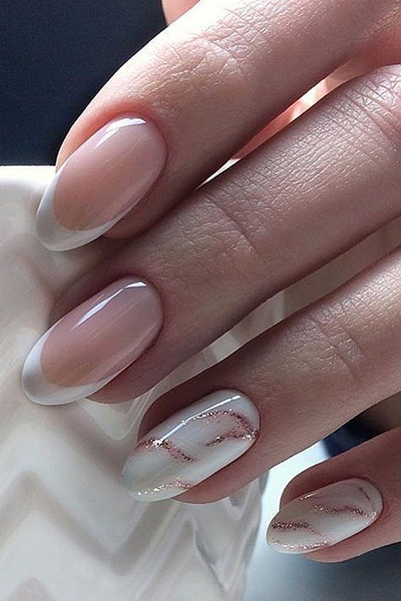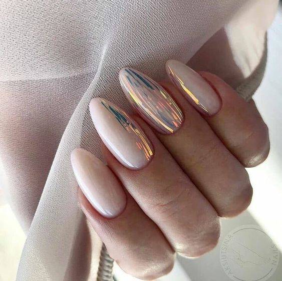 Все нюдовые тона – это прекрасная база для делового маникюра. Чтобы розоватые и бежевые покрытия не выглядели скучно, их можно дополнить мелкими рисунками, втиркой, акриловой пудрой, фольгой.