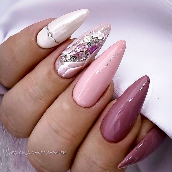 - миндаль: это форма, которая похожа на овал, но более широкая сверху. Она создает визуальное удлинение, делая пальцы более изящными;