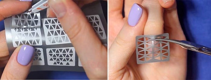 Аналогично к скотчу пользуются и трафаретами. Отклеив его от бумажного основания, трафарет располагают на ноготке, а после окрашивания другим цветом и высушивании лака снимают. Трафареты в использовании гораздо удобнее, чем скотч или клейкая лента, так как воспользоваться им можно сразу, без предварительного вырезания фигур.