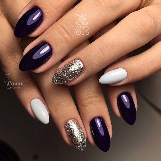 Палитра синих оттенков очень богата. Лучше выбирать из неё самые сдержанные тона, которые будут сочетаться с ахроматическими или нюдовыми цветами. В качестве декора можно использовать небольшое количество серебряного или золотого лака.