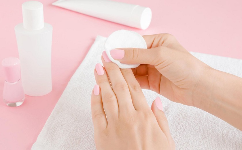 - Если на ногтях остались следы старого лака, удалите его с помощью салфетки или ватного тампона, смоченного в нежирном средстве для снятия лака.