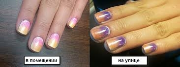 Что касается существенных изменений окружающей температуры, то здесь наблюдается совсем иная картина. Так, например, опустив ногти в холодную воду, лак может выдать серый цвет, в горячую – желтый и т.д.