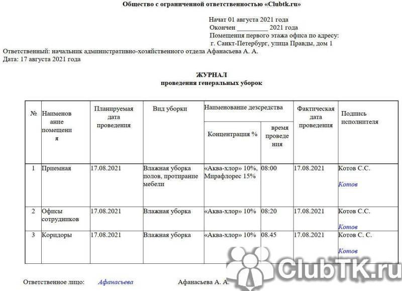 А это пример заполненного журнала работ по санитарной обработке помещений: